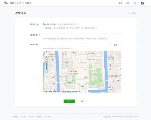 登錄公眾號(hào)后臺(tái)(或小程序后臺(tái)),進(jìn)入“附近的小程序”開通功能后,需提供地點(diǎn)的經(jīng)營(yíng)資質(zhì)信息。